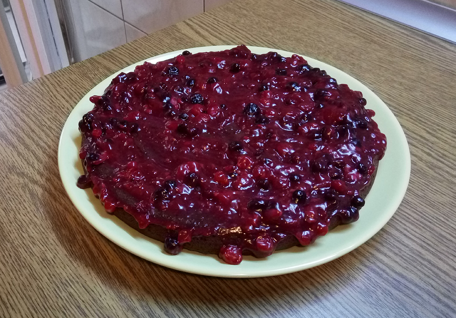 Now it’s time to make the topping. Heat the forest frozen fruit gently with 30 ml/1 fl oz water, and then, when it starts to simmer, lower the heat a little and add the slurry (cornstarch dissolved in a few tablespoons of water). Stir for about a minute, or a minute and a half, but not longer, as you then run the risk of cornstarch breaking down and the topping mix becoming thin again. So after a minute, if it’s thick enough, remove it from the heat and add it to the top of your cake with a plastic scraper or a spoon.