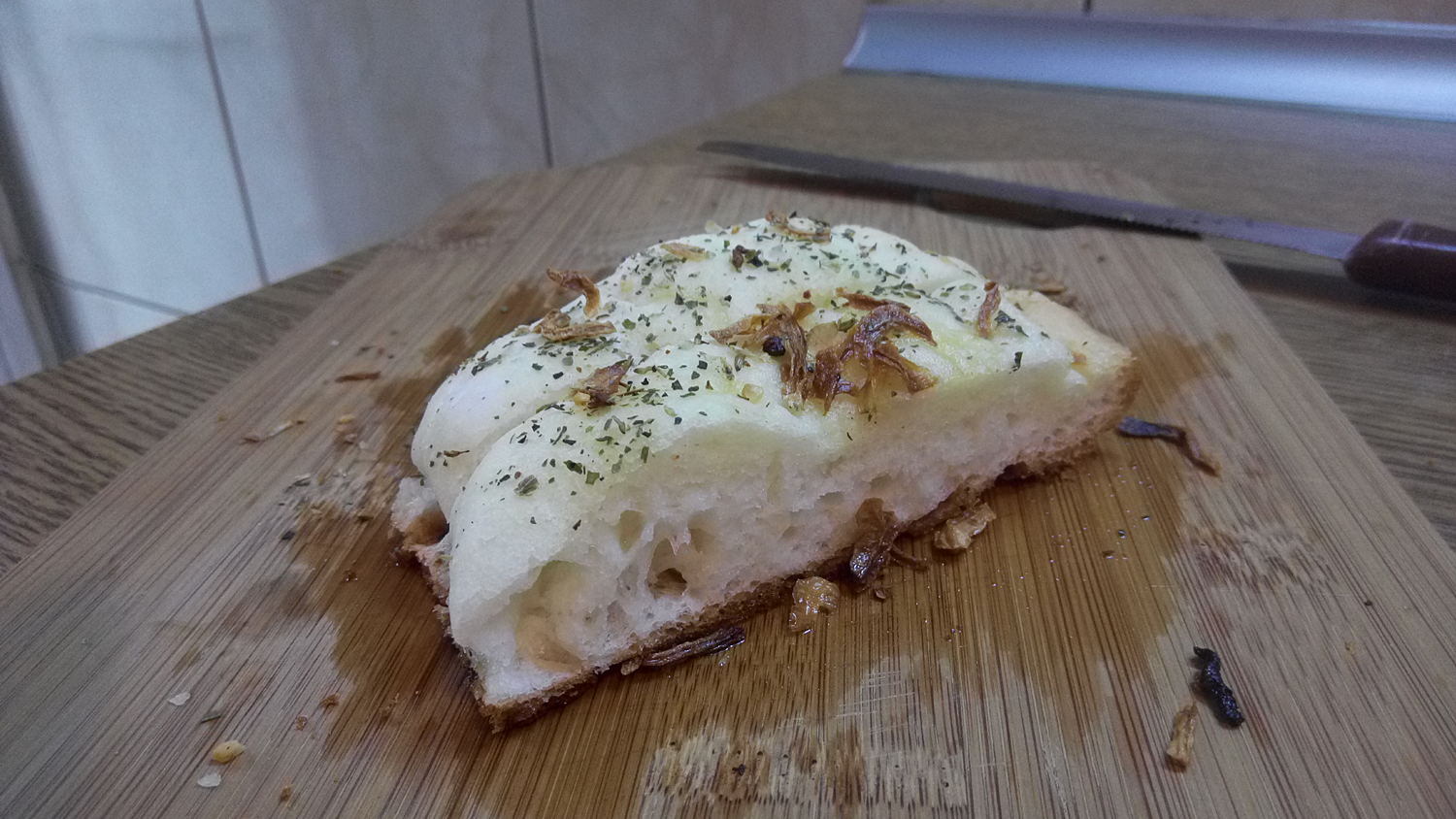 Add the onion flakes and tomato spice mix (as dusting from a bottle or using your fingers), and then drizzle the olive oil (about 50 ml) on top. I used a little too much olive oil—I should have used my index finger to partially cover the mouth of the bottle.