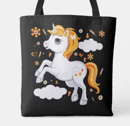 I get the sense though that for many people in Halloween-celebrating countries, and especially for (most) children, this holiday is just pure fun. I’m trying to see it more like that myself too, but for now I admit I can’t wrap my mind around it, which is why when I tried to come up with some creative designs for Halloween trick-or-treat tote bags, I came up empty. But I did find some very funny and cute image concoctions on Zazzle. Here are some of them.