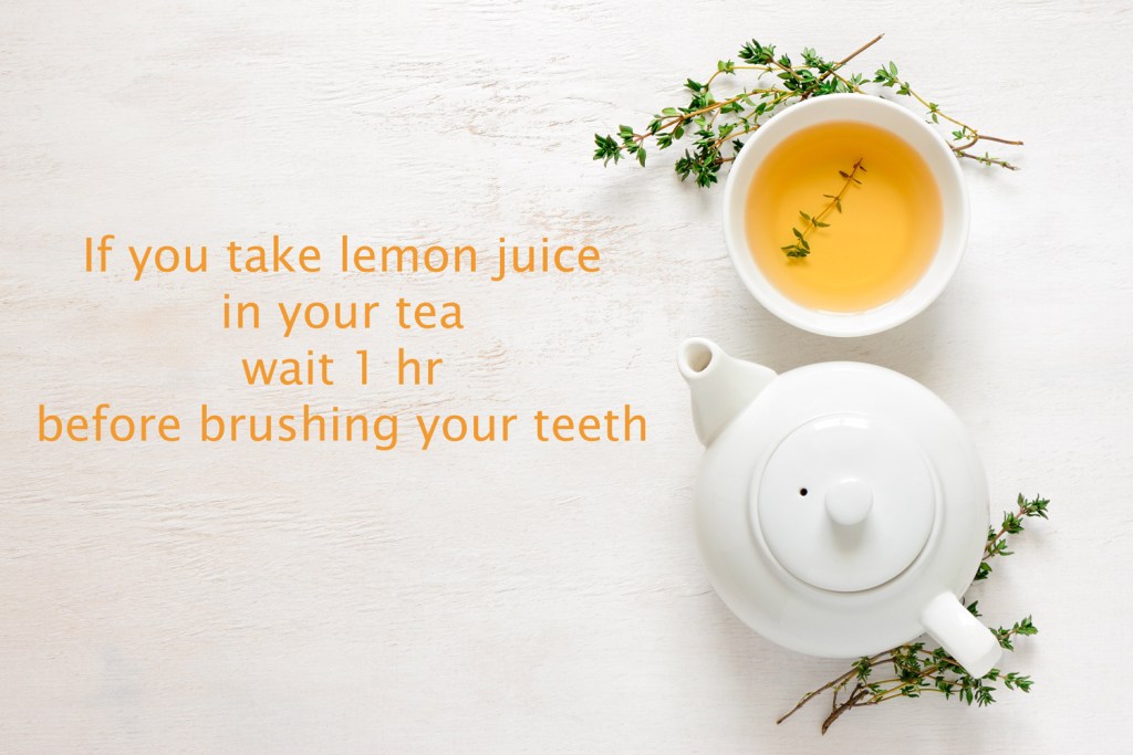 Today’s Tip is about lemon juice and tea. I often take lemon juice in my tea, and my tendency was to brush my teeth right afterward, as my teeth are very sensitive. Then I wondered about it and I read online that brushing your teeth right after consuming something acidic (that also includes oranges and grapefruit) can damage your softened enamel.