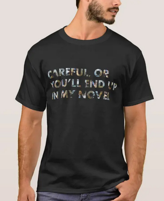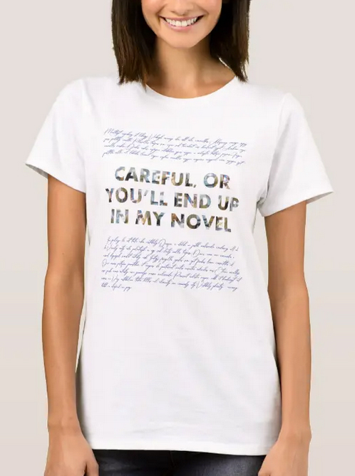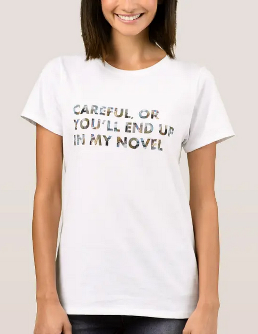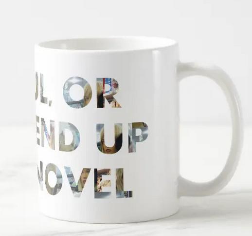 I made two designs with this writers’ meme/slogan, and they both include faces, and then used them on T-shirts, mugs, mousepads, notebooks and journals, etc. I intended these designs and objects as fun statements at writers’ conferences and in certain groups of friends and acquaintances, and have, indeed, sold a number of objects with these designs, possibly for these very purposes. They also make great gifts for the writer(s) in your family and in certain circles of friends (NaNoWriMo writers, anyone?).