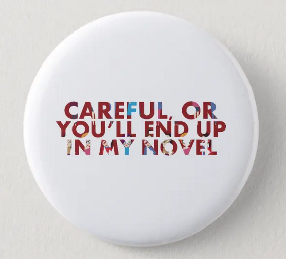 As I mentioned above, I also have another design with this “Careful, or” meme. That one is fun too, in fact maybe more so because you can see more faces. So whereas this first design is more mysterious and makes you work harder to see the faces hidden in there, this one offers an instant recognition of what the design is about, as you can spot several bespectacled faces right away. Here it is, this second version, on a pinback button.