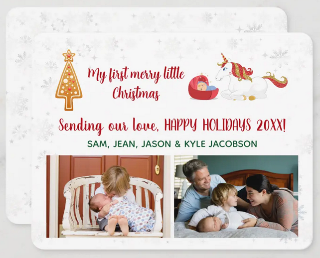Then there is, for me, the question of new baby announcements. I created lots of those—and not only cards but also photo frames, magnets, and then ornaments, keychains, and other items—and those didn’t get much traction. But I keep at it, because I had a new idea this year: to create cards with a unicorn and a baby in a bassinet, where the baby has different skin tones. I wrote a post about that, and in this post I’ll show you the new baby photo cards I created for Christmas!