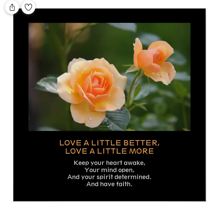 The words are mine. (I hope you enjoy them.) I have created four posters with this quote: one with white roses, a second one with orange roses, a third one with the blossoms of what seemed to be a decorative peach tree, and a fourth one with the wonderful pink and white flowers of a magnolia tree.