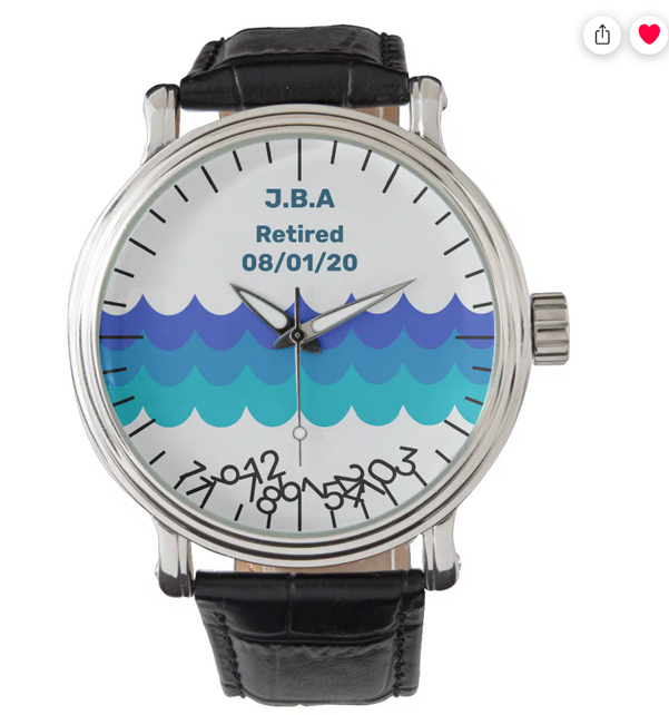 I also created pillows with “No Boss / No Problem” and “Goodbye Tension / Hello Pension” but people seem to prefer watches to accent pillows despite liking these slogans. So . . . I created a design with “No Boss / No Problem” for a retirement watch, to have a retirement keepsake with something of both these ideas.